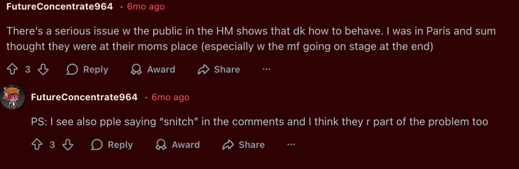 In this post-COVID, Black Mirror-esque era, etiquette is eroding. It’s not just that young Gen Zers endanger themselves and others for TikTok- it’s that many genuinely don’t seem to know how to behave in these spaces. The line between rebellious chaos and outright disrespect has blurred beyond recognition. Much like the “pranks” that masquerade as harmless fun while targeting hospitality workers, this new breed of concertgoer sees ruining a show for hundreds as a quirky stunt for internet clout, and the impact on everyone else is an afterthought, if a thought at all.