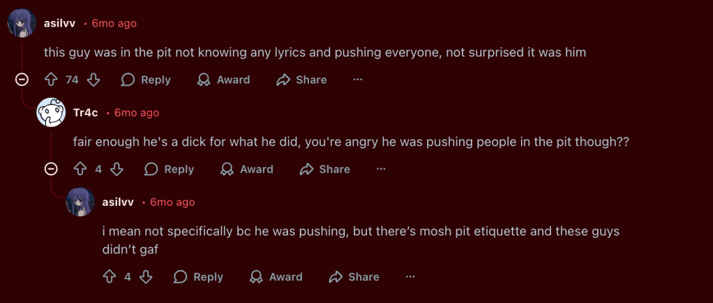 Online, the Haunted Mound subreddit lit up. Outraged disavowals, disbelief, and speculation flooded in. Users doxxed the suspected attendee, posting photos, recounting behaviours, and sharing allegedly overheard comments. As I scrolled through posts calling him “public enemy number one” and wishing him unspeakable violence, one thing was clear: fans were out for blood. I, too, was aggressively disgruntled, though in the hours and months that followed, my anger shifted away from the culprit himself toward what felt like a broader cultural shift.